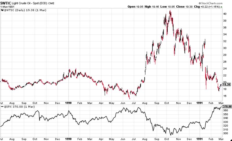 In 1990, when Iraq invaded Kuwait, oil prices quickly doubled from around $20 per barrel to more than $40. You can see that during that move in oil, the S&P 500 had a nearly identical inverse reaction.