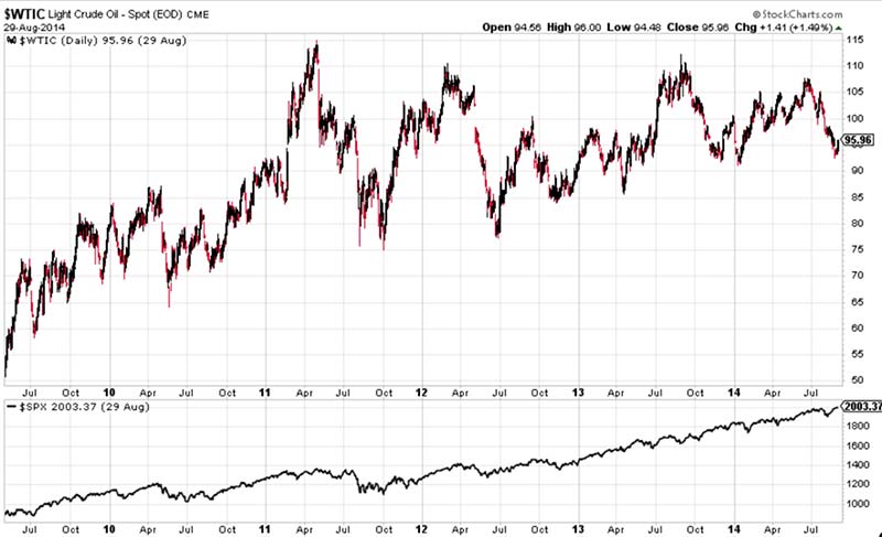 After the pounding from the financial crisis, stocks got up off the mat, even as oil prices doubled between 2009 and 2011 and then stayed elevated for several years. The S&P continued higher despite the high price of oil.
