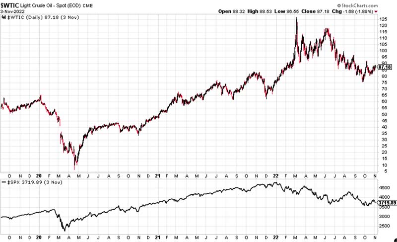 The COVID crash in 2020 obliterated both oil prices and stock prices. They quickly recovered together until oil hit $100, which was around the same time that stocks topped out and the 2022 bear market began.