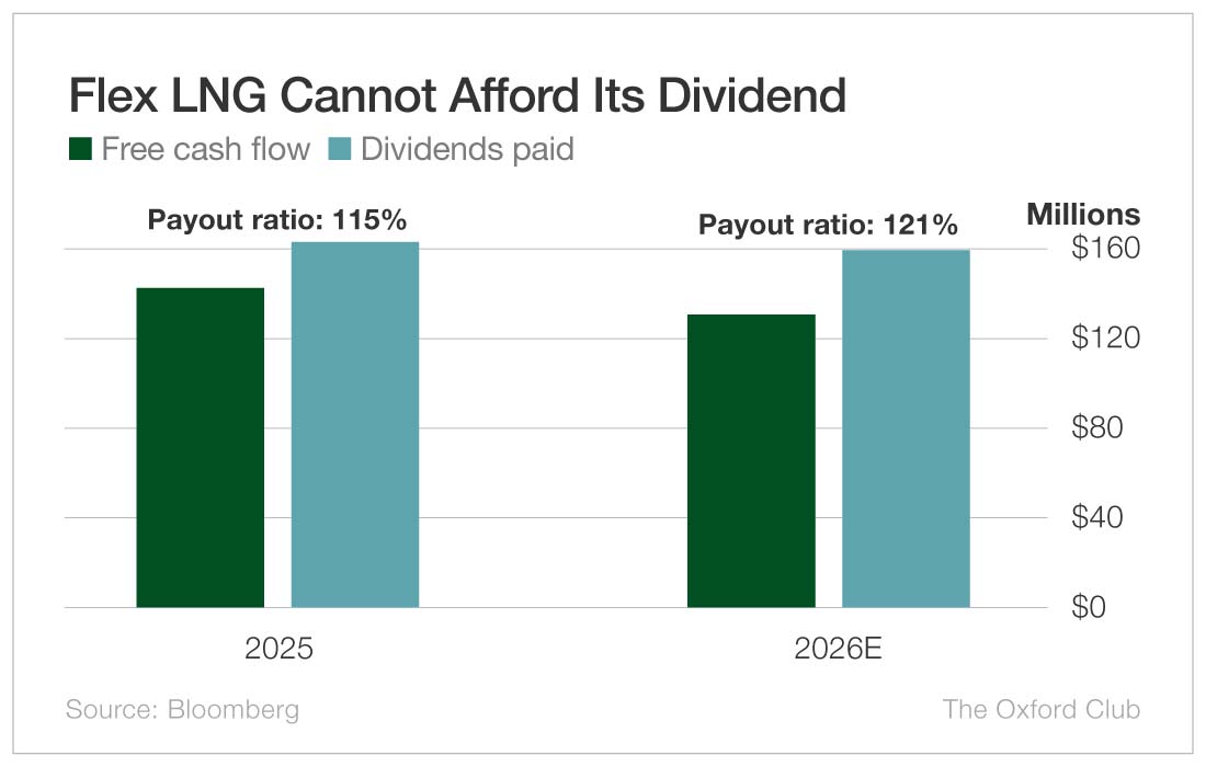 Flex LNG generated just $141 million in free cash flow in 2025 while paying out $162 million in dividends. That came out to a payout ratio of 115%. In other words, for every $1 of free cash flow it made, the company paid out $1.15.